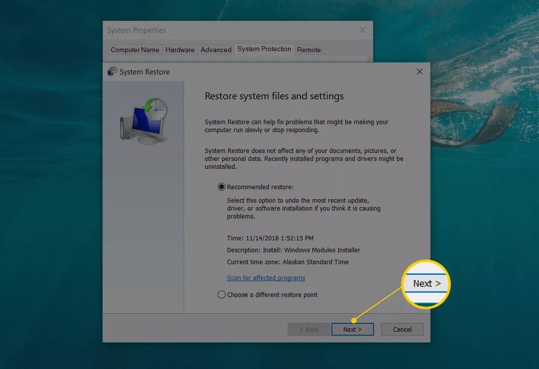 عند تحديد نقطة الاستعادة التي اخترتها، انقر فوق الزر التالي.