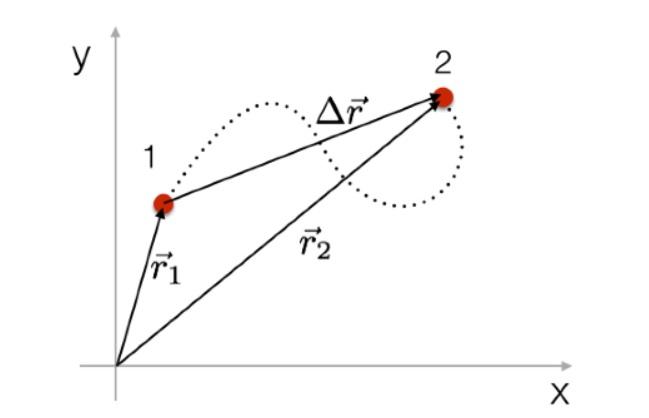 - شعاع الإزاحة: ليكن لدينا جسم يتحرّك من النقطة 1 إلى النقطة 2، يعبّر شعاع الإزاحة عن الشعاع المتجّه من النقطة الأولى إلى النقطة الثانية، ويحسب من خلال العلاقة التالية: