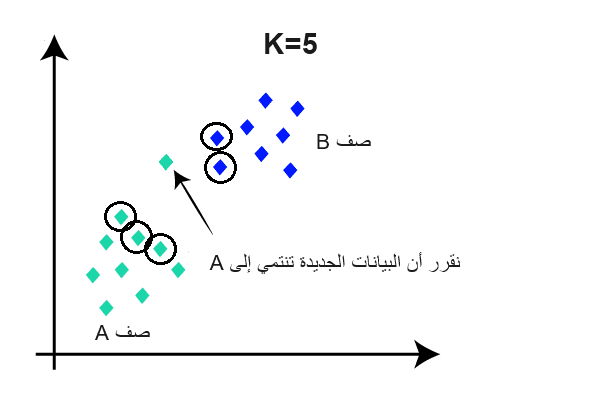 في المثال السابق إذا اخترنا k=5 فإننا في هذه الحالة نبحث عن أقرب 5 جيران، ونعد كم من هذه الجيران ينتمي إلى الصف B وكم ينتمي إلى الصف A والعدد الأكبر هو من يقرر النتيجة.