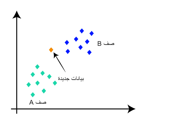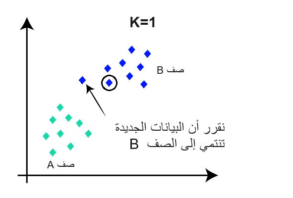 نجد أن اقرب جار ينتمي إلى الصف B وبالتالي نقرر أن البيانات الجديدة تنتمي إلى B.