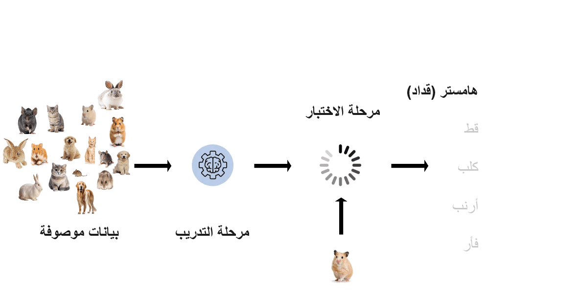 أما المرحلة الثانية، فهي مرحلة الاختبار حيث علينا أن نعطي النموذج الصورة فقط بدون الصفة وعليه هو أن يعطينا الصفة الصحيحة. بناء على النتائج في مرحلة الاختبار علينا أن نُقرر فيما اذا كانت مرحلة التدريب قد تمت أو أننا بحاجة إلى تدريب النموذج بشكل أكبر.