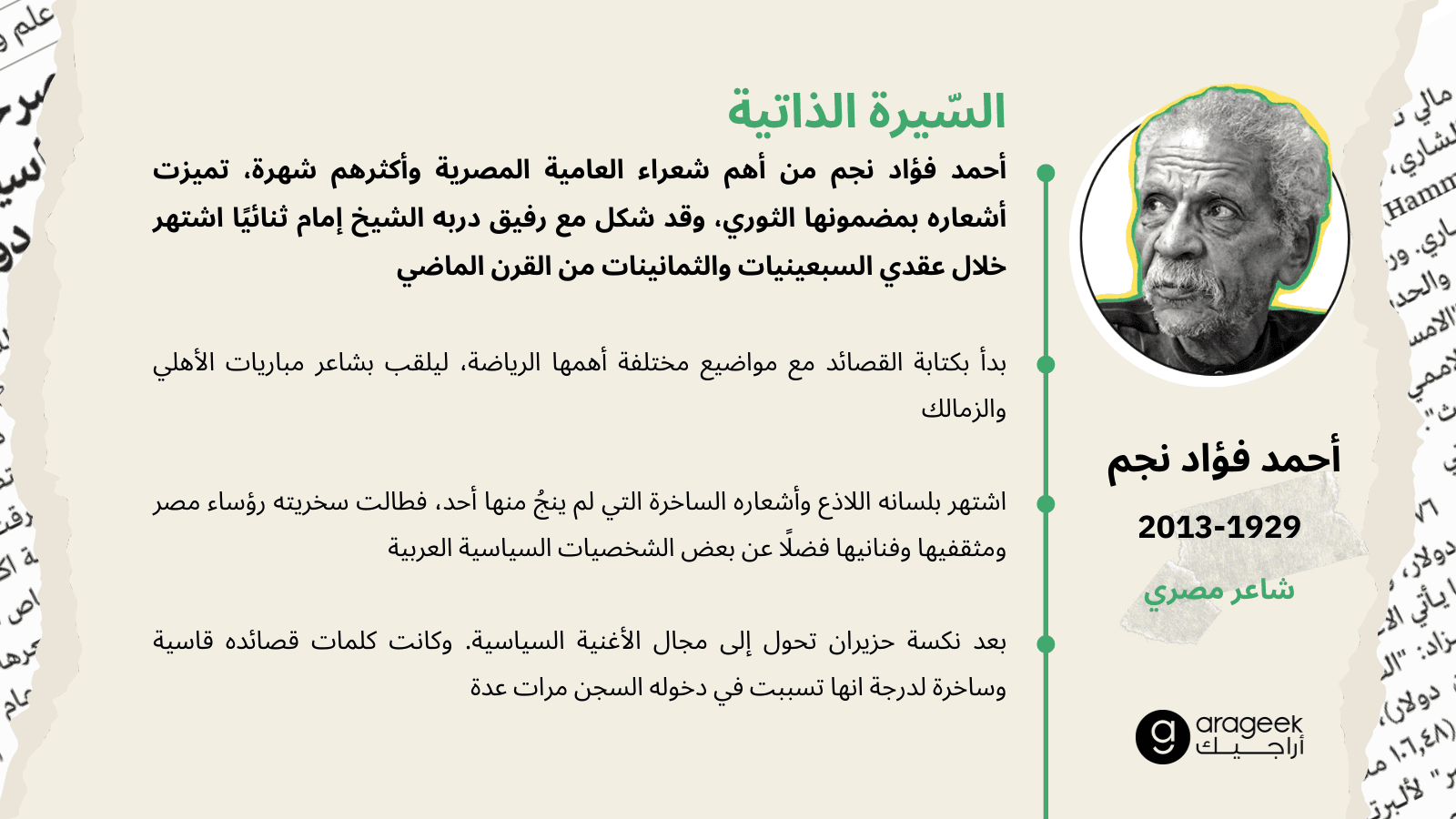 أحمد فؤاد نجم (الفاجومي) من أهم شعراء العامية المصرية وأكثرهم شهرة. ولد في محافظة الشرقية سنة 1929، وبدأ حياته الشعرية بكتابة القصائد في مواضيع مختلفة أهمها الرياضة، إذ كان يطلق عليه في فترة الخمسينيات لقب: شاعر مباريات الأهلي والزمالك. تعرّف على رفيق دربه الشيخ إمام عيسى عام 1962، وكانت باكورة أعمالهم الفنية أغنية “أنا أتوب عن حبك أنا”.