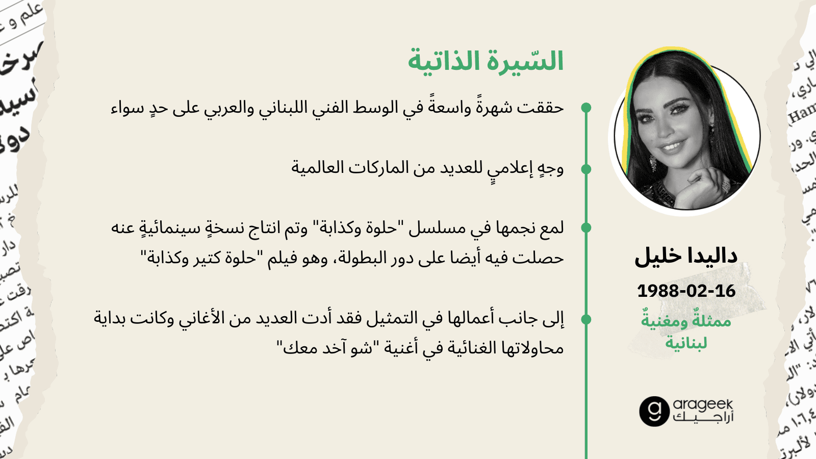 داليدا خليل ممثلة ومغنيةٌ لبنانية، وُلدت ونشأت في لبنان وتنتمي لعائلة لبنانية شمالية، حاصلة على شهادة من أكاديمية الفنون. تتميز داليدا بجمالها وحضورها اللافت وتمتلك موهبةً مميزةً ساعدت في سطوع نجمها في سماء الفن، فأثبتت حضورًا متميزًا في سنواتٍ قليلةٍ، بعد بداية مسيرتها الفنية عام 2007.