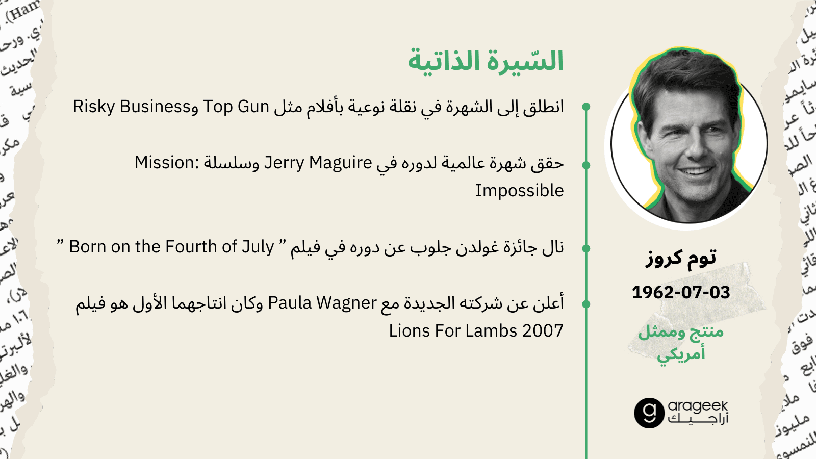 توم كروز، ممثل ومنتج أميركي. لمع نجمه بعمر التاسعة عشر في فيلم Endless Love، مرشح لعدة جوائز أوسكار وحائز على الغولدن غلوب.