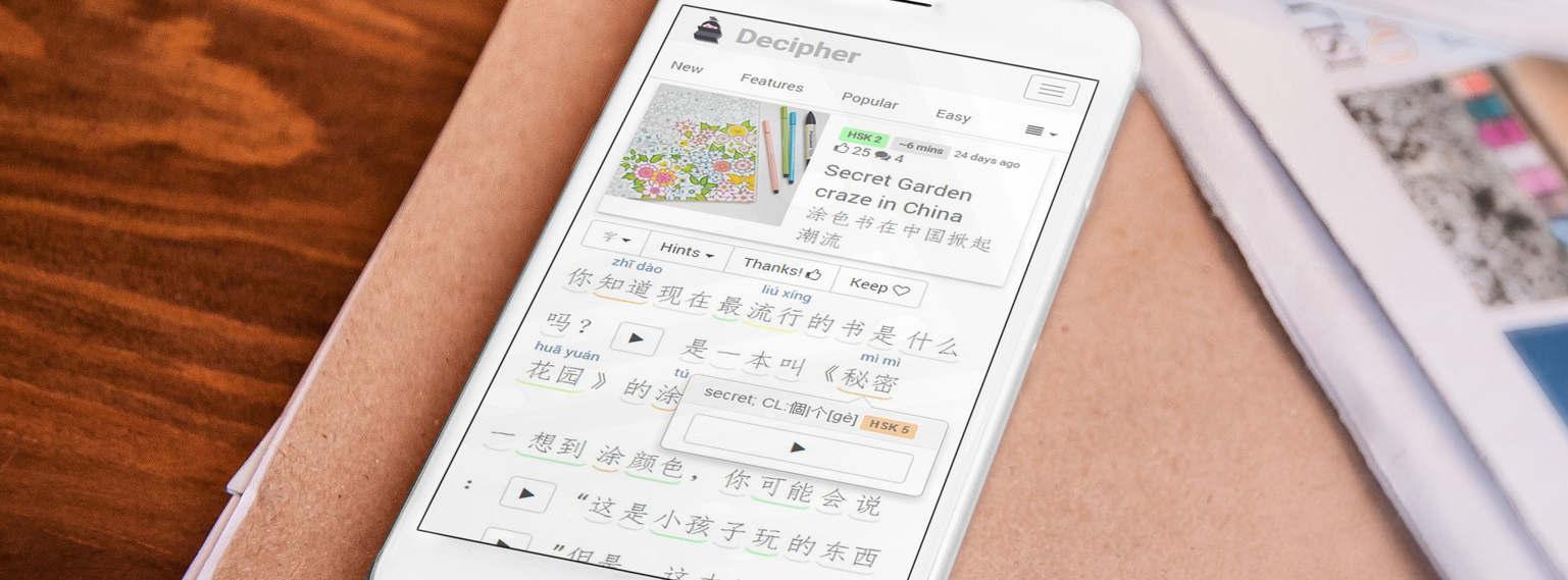 بعد أن تعلمت نطق الرموز الشائعة واستمعت للفيديوهات التعليمية ومارست اللغة بشكل كافي، عليك الآن أن تبدأ في القراءة باللغة الصينية قدر الإمكان، لا تترك مقالاً أو موضوعاً متعلقاً باللغة إلا وتقرأه، فالقراءة تساعدك على تفادي الأخطاء الكتابية التي تقع فيها وفهم أكثر للقواعد اللغوية وتطبيقها، ومعرفة تكوين الجمل وسياق الكلام، وكيفية استخدام الكلمات في موقعها الصحيح من الجملة، لذلك لا تؤجل القراءة أبداً، وهنا اُرشح لك تطبيقاً جيداً ينشر مقالات صينية لمختلف المستويات “Decipher”، يمكنك تحميله على هاتفك المحمول وقراءة المقالات التي يعرضها حيث تقرأ مقال أو أكثر بشكل يومي مما سيجعلك تلاحظ فرق المستوى بعد فترة قصيرة، وهناك تطبيق آخر للقراءة اسمه “知乎” يمكنك استخدامه عند وصولك لمستوى متقدم في اللغة.