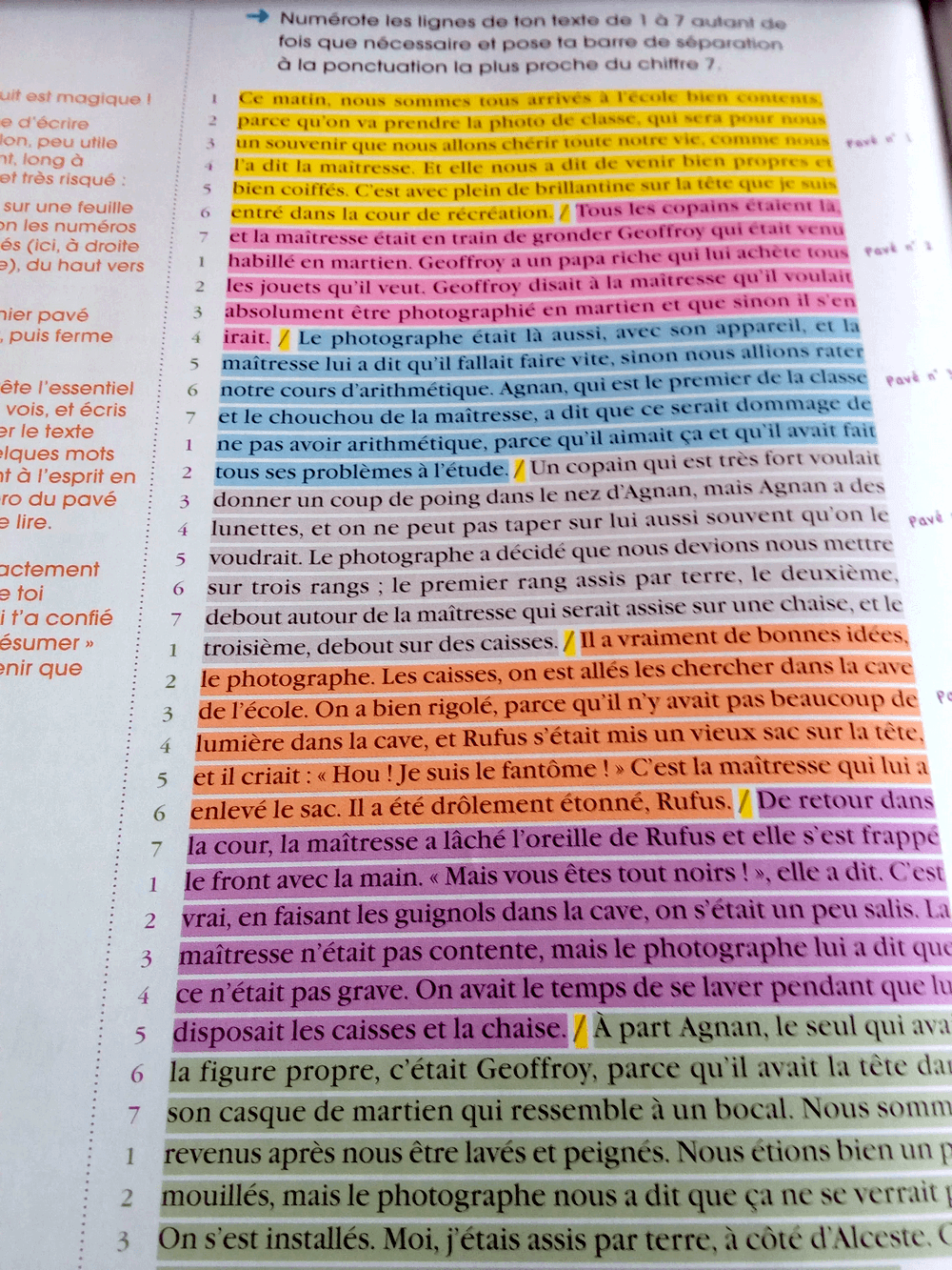 - بعد أن تضع علامة على نقطة الترقيم، تابع تعداد الأسطر بنفس الطريقة إلى أن تحصل في الأخير على مساحات، أو كما سمته الكاتبة غينيارد “رُصُفٌ” من 5 إلى 7 أسطر تفصلها نقاط ترقيم، كما هو موضح في المثال أسفله: