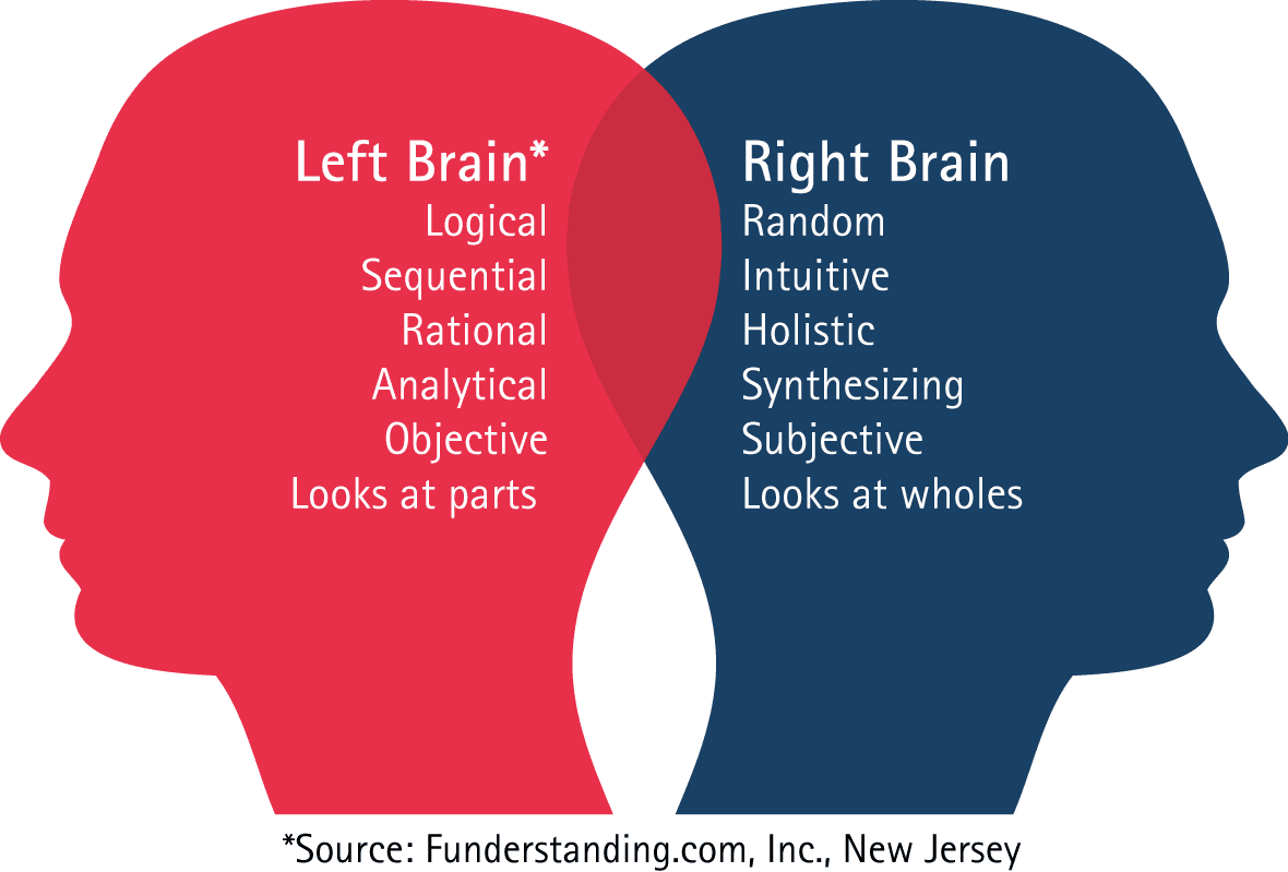 وفقاً لنظرية سيطرة الجزء الأيمن أو الأيسر من الدماغ، كل جزء من الدماغ يتحكم في أنواع مختلفة من التفكير لهذا هناك أشخاص تفضل وتبرع في نوع معين من التفكير على الآخر. على سبيل المثال، الشخص الذي يستخدم الجزء الأيسر من الدماغ يقال إنه يتميز في التفكير المنطقي والتحليلي وموضوعي بينما يتميز الشخص الذي يستخدم الجزء الأيمن من الدماغ بأنه حدسي وعميق التفكير وغير موضوعي.