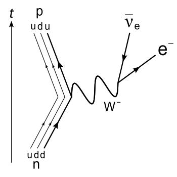 عام 1933، ابتكر الفيزيائي الإيطالي إنريكو فيرمي (Enrico Fermi) نظريةً لشرح أصل القوى النووية الضعيفة، وأطلق عليها عملية تحلل أو اضمحلال جسيم بيتا، ويشير هذا الاضمحلال إلى عملية تحول النيوترون عديم الشحنة عمليًّا (محايدة أو متعادلة الشحنة نظريًّا) داخل النواة إلى بروتون موجب، وذلك بطرده للإلكترون السالب، ومن هنا جاءت تسمية القوة الضعيفة، حيث تحول النيوترون إلى بروتون وإلكترون ونيوترينو (Neutrino).