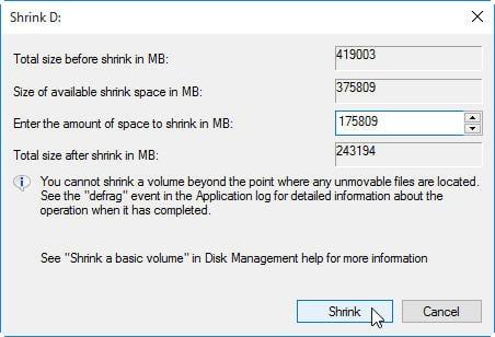 بعد انتهاء الحاسب من حساب المساحة المتاحة للتقسيم على القرص اختر المساحة التي تريد تخصيصها واضغط تقليص Shrink.