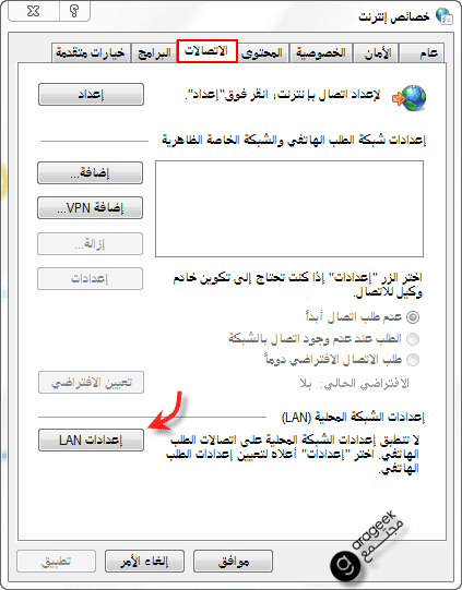 وانقر فوق الزر "فتح إعدادات الخادم الوكيل الخاصة بالكمبيوتر" لفتح نافذة خصائص الإنترنت الصغيرة.