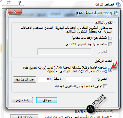 قم بتمكين إعدادات البروكسي عن طريق تفعيل خيار "استخدام خادم الـ Proxy لشبكة الاتصال المحلية الخاصة بك".