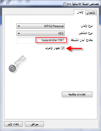 - الضغط على خيار إظهار الأحرف Show characters لإظهار كلمة السر الحالية لجهاز واي فاي المتصل.