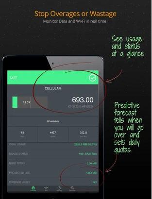 يعمل التطبيق مع أي نوع هاتف محمول من نوع آيفون، و يقوم بإعلامك بالكمية التي تستهلكها من الانترنت سواء على شبكات واي فاي او بيانات الهاتف المحمول من خلال رسومات بيانية يتغير لونها بناءً على مدى استخدامك للإنترنت، ليس هذا وحسب وإنما يمكنه التنبؤ بمعدل استهلاكك وفق معدل استخدامك اليومي للإنترنت، لذلك سيقوم التطبيق بتنبيهك في حال استهلكت يومًا بيانات أكبر مما تستهلكه في العادة، تكلفة تحميل التطبيق 0.99 دولار.[footnote] the best apps to monitor internet usage، من موقع: lifewire.com، اطّلع عليه بتاريخ January/21/2022 | 11:15 AM[/footnote][footnote] the_best_ios_apps_to_track_your_data_usage، من موقع: appadvice.com، اطّلع عليه بتاريخ January/21/2022 | 11:15 AM[/footnote]
