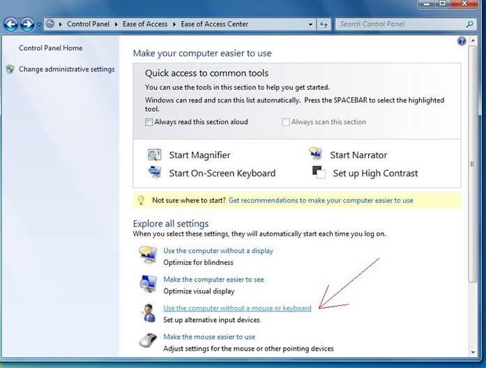 وإذا أردنا إظهار لوحة المفاتيح على شاشة تسجيل الدخول في Windows 7 نذهب إلى قائمة ابدأ ومنها إلى لوحة التحكم، وثم نختار قائمة سهولة الوصول ثمّ مركز سهولة الوصول ومنها نجد مجموعة خيارات تحت قائمة استكشف كل الإعدادات Explore all setting، ومنها نختار استخدام الكمبيوتر بدون لوحة التحكم أو الماوس.