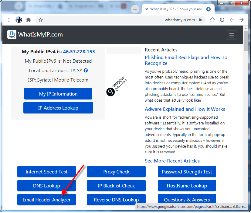 - انتقل الآن إلى الموقع WhatsMyIP.com وانقر على خيار البحث عن الـIP أو IP Lookup، الذي ستجده في القائمة الموجودة أعلى الصفحة. يوجد على الجانب الأيسر قائمة الخيارات، اختر منها محلل تذييل البريد الإلكتروني Email Header Analyzer (أو ستجد خيار محلل تذييل البريد الإلكتروني في الصفحة الرئيسية).