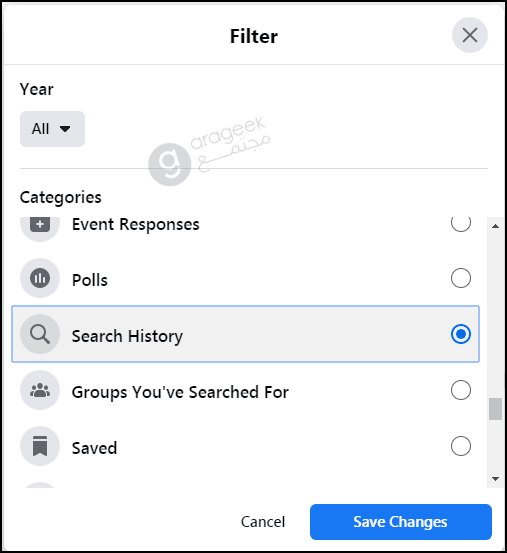 - مرر للأسفل حتى تجد سجل البحث Search History. ثم اضغط حفظ التغيرات Save changes