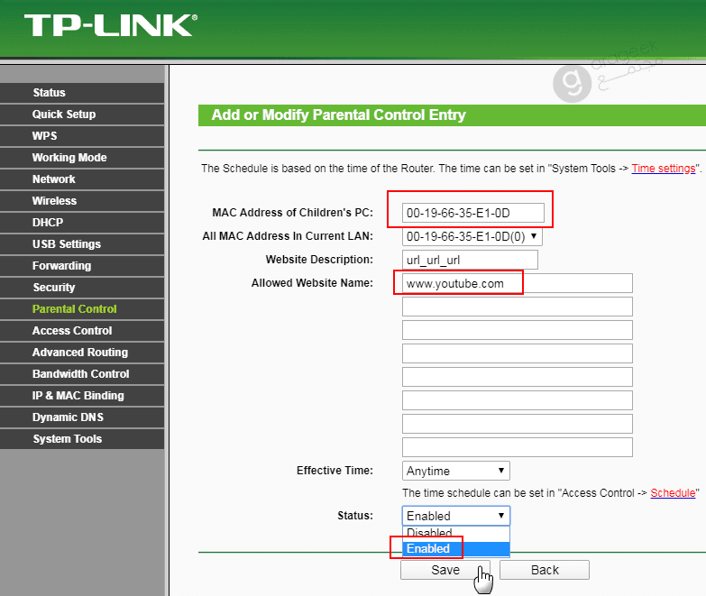ثم أدخل عنوان هاتف الطفل في الحقل الواضح في الصورة في جهاز الراوتر MAC Address of children's PC.