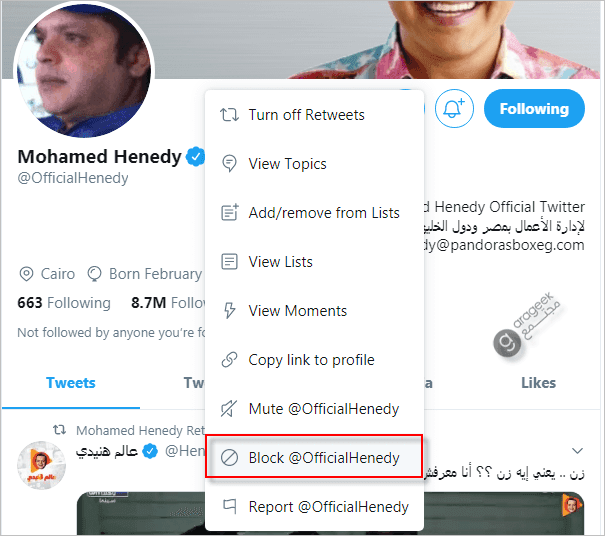 [footnote]هاري غينيس، How To Block Someone on Twitter، من موقع: www.howtogeek.com، اطّلع عليه بتاريخ 09-12-2018[/footnote]
