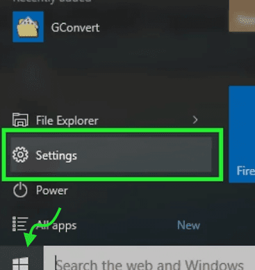 اضغط على شعار ويندوز الموجود في الزاوية السفلى من الشاشة ثم انقر على أيقونة الإعدادات (Settings) والتي عادةً ما تكون على شكل مسننٍ.