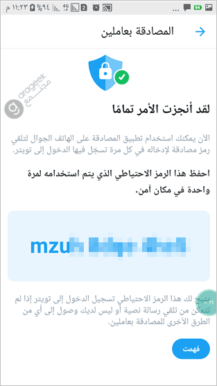 سيزودك تويتر برمز أمان احفظه لاستخدامه عند الطلب.