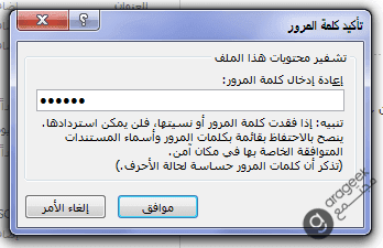 أدخل كلمة السر التي تريدها ثم اضغط موافق Ok، وهكذا سيتم طلبها في كل مرة يحاول أحدٌ ما فتح المستند.