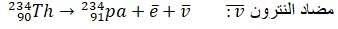 يتحول نترونٌ واحدٌ موجودٌ في نواة الذرة إلى بروتونٍ وإلكترونٍ ومضاد النترون حيث ينبعث الأخيران خارج النواة التي يزداد عدد بروتوناتها واحدًا فيتغير العنصر إلى آخر مختلف، وكمثال على ذلك سنأخذ اضمحلال ذرة الثوريوم 234 متجولة إلى عنصر البروتكتينيوم 234 حيث نجد ازدياد عدد البروتونات بروتونًا واحدًا مع بقاء ذات الشحنة الكلية دون تغيير نتيجةً لظهور إلكترون آخر سالب الشحنة وذلك وفق المعادلة:[footnote]،Beta Decay، من موقع: education.jlab.org، اطّلع عليه بتاريخ 6-11-2019[/footnote]