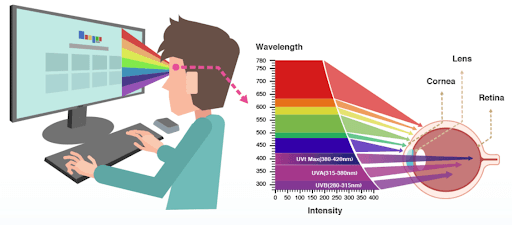 يعتبر الضوء الأزرق من أكثر العوامل التي تسبب مشاكل عند الجلوس لوقت طويل أمام الشاشة، حيث من الممكن أن يسبّب العديد من الأعراض مثل الصداع وإجهاد العينين واضطرابات النوم بالإضافة إلى مشاكل صحيّة دائمة مثل تلف شبكيّة العينين وضعف البصر أيضاً، وتجدر الإشارة إلى أنّ الأطفال معرّضون بشكل أكبر لمخاطر تلف العينين لكون العدسة البلوريّة لديهم أقلّ قدرة على فلترة الضوء الأزرق ومنعه من التأثير على العينين.
