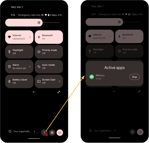 "Foreground Service Manager" أو كما يعرف اختصارًا بـ "FSM"، هو مدير خدمات يعرض جميع التطبيقات التي لها خدمة قيد العمل، ويُمكن الوصول لهذه القائمة عبر سدل شريط التنبيهات والنقر على أيقونة مدير الخدمات في الزاوية السفلى، وستلاحظ التطبيقات التي تعمل مع إمكانية إيقاف كلٍّ منها بشكل منفرد.