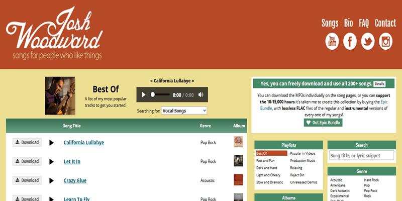 Josh Woodward مغني وكاتب أغاني لديه تجربة إطلاق ألبومات بلغت أحد عشر ألبومًا خلال العقد الماضي وحده، كرس موهبته لإنتاج وتأليف المقطوعات الموسيقية لصانعي المحتوى على الإنترنت، مع أكثر من ستة مليون ونصف تحميل لمقطوعاته، يبدو خيارًا رائعًا لكل صانع محتوى مرئي على يوتيوب.
