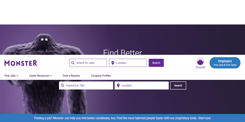 يُعدّ Monster.com المعاد تصميمه حديثًا أحد أقدم محركات البحث عن الوظائف على الإنترنت. في حين أن بعضاً من فائدته قد تضاءلت في السنوات الأخيرة بسبب عدم وجود تصفية جيدة ووظائف كثيرة للغاية من قبل جهات التوظيف غير المرغوب فيها، فإنه لا يزال موقعًا مهمًا لإجراء بحث عن وظيفة.