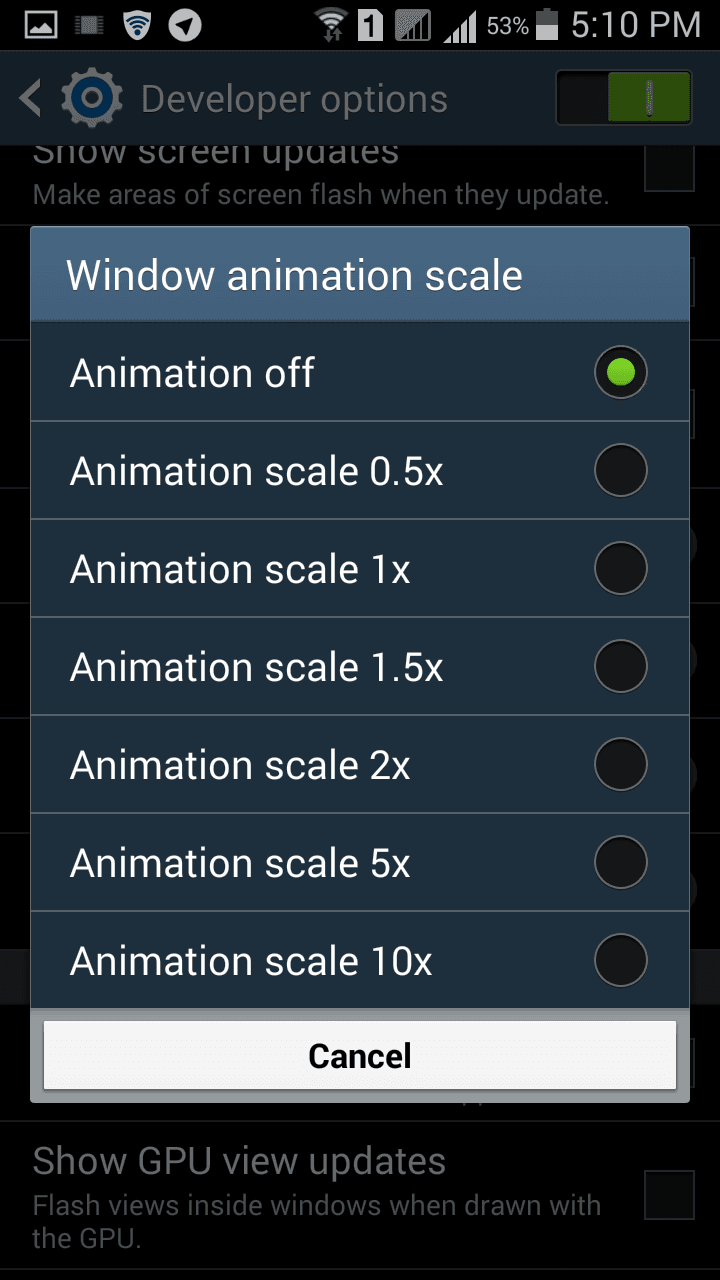 المقصود هنا هي حركة رسومات واجهات النظام حيث يوفر نظام أندرويد ضمن صفحة خيارات المطورين Developer Options ثلاثة خيارات تحكم بنعومة حركة الرسومات، هذه النعومة تستهلك ذاكرة ومعالجة أكبر من أجل إظهارها في أفضل حالات النعومة والانسياب ويمكننا بكل بساطة إيقافها بشكل كامل مما يوفر ذاكرة بشكل جيد وخصوصاً للأشخاص الذي يعانون من بطء بالجهاز ويمكن الوصول إلى هذه الإعدادات عن طريق صفحة خيارات المطورين Developer Options وإعطاء قيمة Animations off لكل من الخيارات الثلاثة التالية: