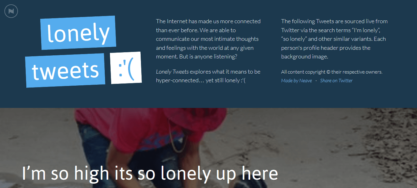 إذا كنت تشعر بالوحدة حاليًا أو لديك مشاعر سلبية تريد التعبير عنها فأنت لست وحدك في هذا العالم. إن هذا الموقع الغريب بعض الشيء ينشر مباشرة ” تغريدات” كتبها الناس عندما يشعرون بالوحدة، و الشيء الجيد أن التغريدات التي ينشرها الموقع لا تحتوي على كلام حزين بل في أغلب الأحيان ستتعرف على ما يفعله هؤلاء في أوقات وحدتهم و الاشياء التي يفعلونها في مثل هاته الظروف.